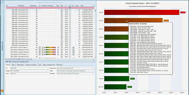 Instead of looking at the critical path on the activity level, you can run simulations on the entire project. Each time a simulation is run, Acumen notes the critical path. As you run more and more simulations, some of the paths get repeated and those most common critical paths are the ones you may want to see.