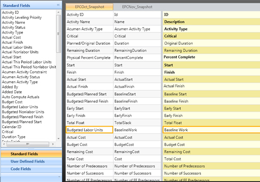 For the Acumen field called Baseline Work, the corresponding default field for Project A (Primavera file) is Budgeted Labor Units whereas in Project B, the same field is known as BaselineWork. Based on the default mappings, Acumen normalizes these fields even though the field names are actually different. Within your workbook, this field is then referred to as Baseline Work.