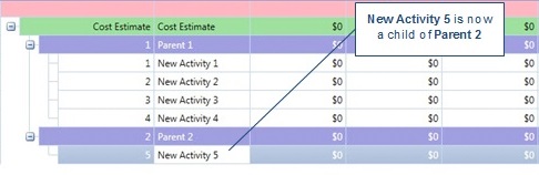 In the example below, New Activity 5 was dragged onto the row titled Parent 2. This makes New Activity 5 a child of Parent 2.