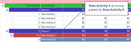 In the example below, New Activity 5 has been turned into a parent activity by adding a new activity (New Activity 6) and dragging it onto the New Activity 5 row.