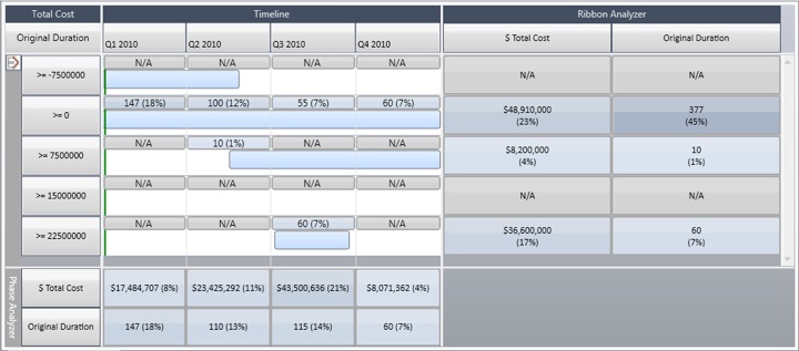 This makes phase-based analysis very powerful because you can analyze both within and across defined phases, accounting for the amount of cost, duration, and work that falls into each phase.