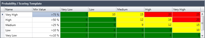 Set probability percentages and score ranges (in the Very Low to Very High columns) that will help you to assess and prioritize risks. Use the color thresholds to adjust the color ranges as needed.