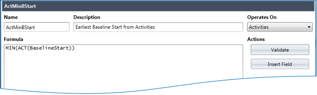 Using the formula below, you can view the earliest baseline start from activities. The BaselineStart field could exist in more than one place (activity, work package, control account, WAD); however, ACT shows you that it is from the activity. This is further confirmed by the Operates On field being set to Activities which means that there should only be activity fields in the formula.