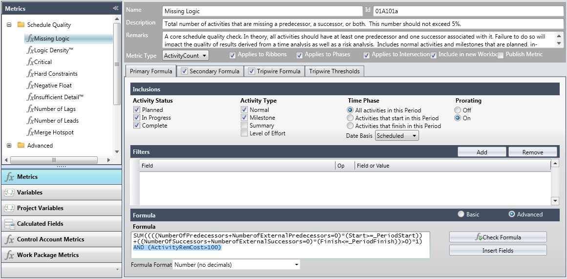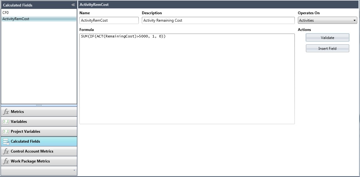 When you are designing a metric, you need to decide whether you are getting data from a different level (activity, work package, control account). If you are, you start by creating a calculated field to pull that data and then use the calculated field in a metric.