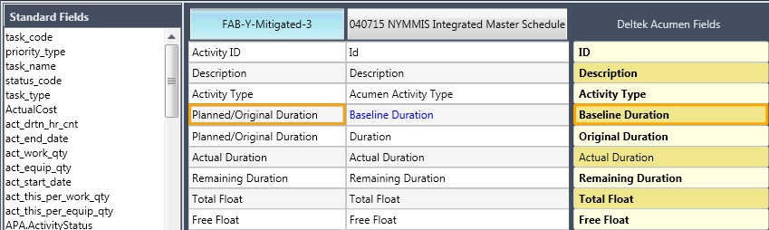 For the Acumen field called Baseline Duration, the corresponding default field for the Primavera project is Planned/Original Duration whereas in the MSP project, the same field is known as Baseline Duration. Based on the default mappings, Acumen normalizes these fields even though the field names are actually different. Within your workbook, this field is then referred to as Baseline Duration.