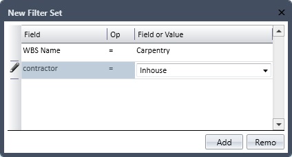 For example, the filter set below shows a filter that defines all activities within the WBS Name called Carpentry where the contractor is Inhouse.