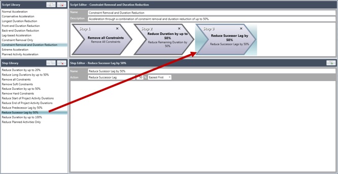 You apply steps to a script by "drag-dropping" the steps from the step library into the script timeline. The timeline defines the order in which the steps are applied during the simulation. Drag the steps within the timeline to rearrange them.