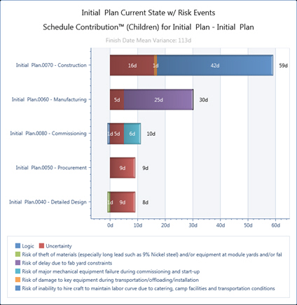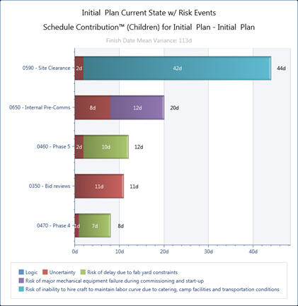 Schedule and Cost Contribution are two risk metrics that report the actual schedule/cost impacts on any given activity (or group) in terms of currency and duration. The Schedule Contribution tornado shows which activities are the biggest risk drivers on the selected activity and, more importantly, it reports in terms of duration.