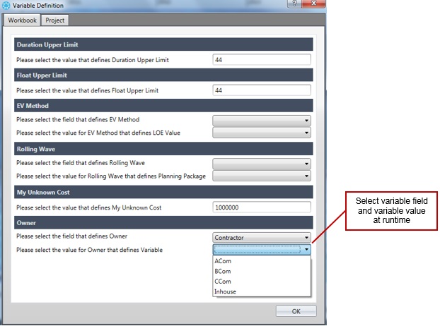 Field variables and value variables are set at the workbook level. Project variables can be set at the project level.