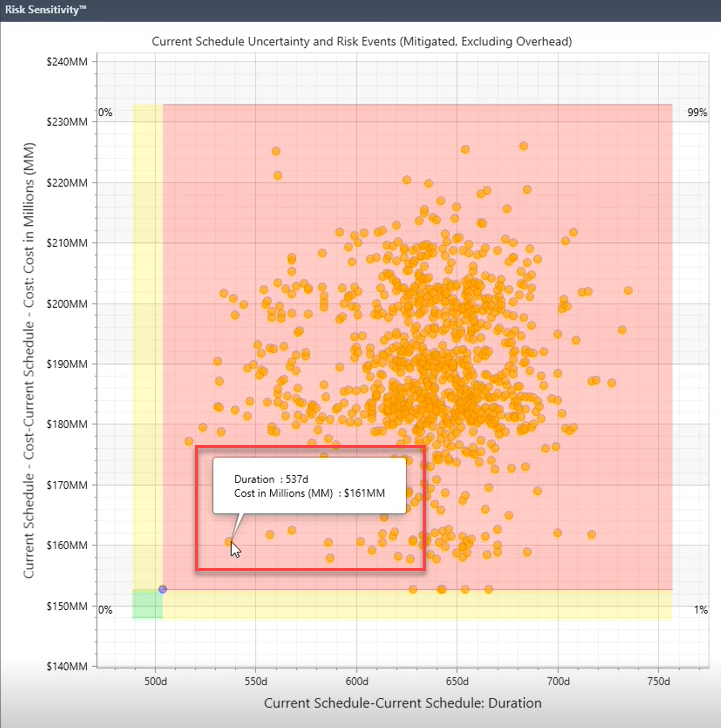 • Deterministic Quadrants provide further insight into the probability of meeting deterministic durations and/or costs. A small portion of all quadrants is visible whether there is data or not. Use the Deterministic Quadrants check box to add/remove the quadrants from the chart.