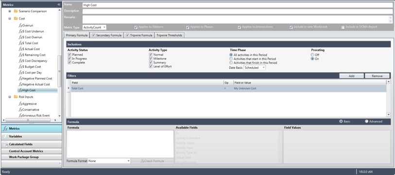 A variable called My Unknown Cost has been created and referenced in a custom metric called High Cost. When an analysis is run, if the variable value has not been set, you are prompted to set a value.