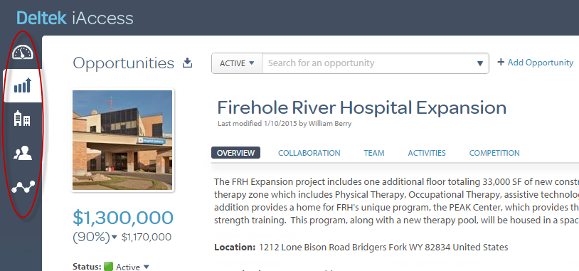 The title or name for the currently selected opportunity, company, or contact displays in the upper-left corner of the area, and key data display down the left edge to provide a summary view.