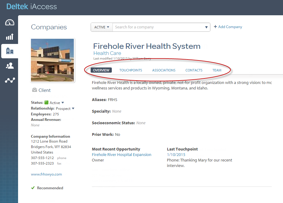 Basic information, such as company name, types of roles (client, subconsultant, and so on), relationship to your firm, and primary address, is always visible. Other information displays on the Overview, Touchpoints, Associations, Contacts, and Team tabs. (Your system administrator may also add custom tabs to supplement these standard tabs.)