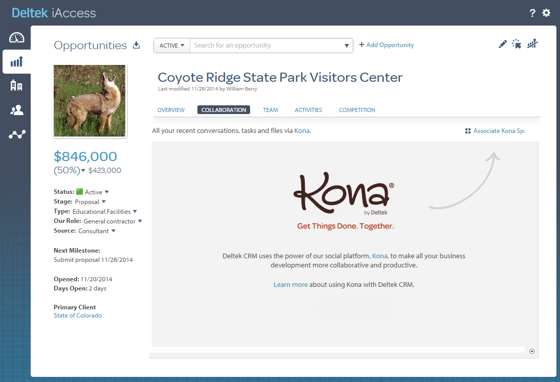 Use the Collaboration tab in the Opportunities area to associate opportunities with spaces in Kona Business and to access those spaces from within