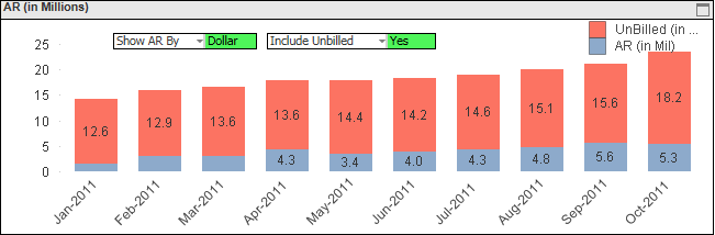 Select Dollar in Show AR By to display the AR chart. If you also select Yes in Include Unbilled, the chart displays stacked bars with a segment for AR and a segment for unbilled. If you select No in Include Unbilled, the chart displays only AR: