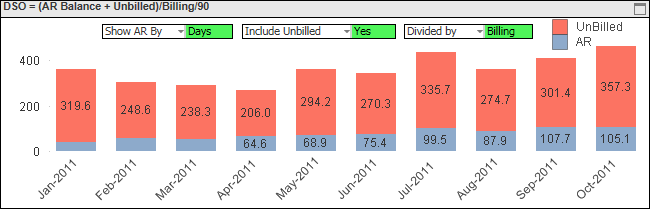 Select Days in Show AR By to display the DSO chart. If you also select Yes in Include Unbilled, the chart displays stacked bars with a segment for DSO based on AR and a segment for DSO based on unbilled. If you select No in Include Unbilled, the chart displays only DSO based on AR: