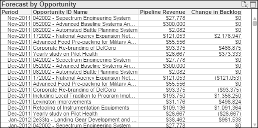 For the current period and each future period for which data exists, the table displays the estimated revenue each opportunity in your pipeline is expected to contribute, along with the resulting change in that opportunity's contribution to backlog. For example, if an opportunity is expected to contribute 10,000 in revenue for a period, that increases forecasted revenue and decreases backlog by that amount. 10,000 displays in Pipeline Revenue and (10,000) displays in Change in Backlog for that opportunity and period.