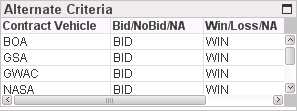 Position the mouse pointer over the first Bid/NoBid/NA cell in the Alternate Criteria table, click the button that appears, and do one of the following: