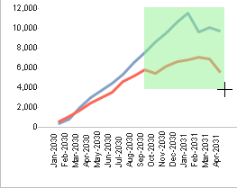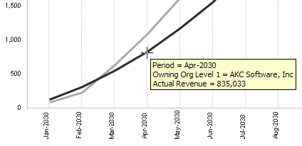 To see the precise value represented by the intersection of a plotted line with the vertical grid line for a horizontal axis value, position the mouse pointer over the intersection point. Costpoint Analytics then displays the intersection value and related information in a data box.