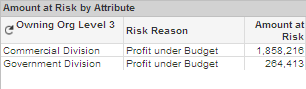 You can narrow the focus of a table by clicking cells in the table. If you click a cell in a column that contains filter values, the table is filtered based on the selected value. If multiple rows have the selected value in that column, all of those rows are selected. If you click a cell in a column that contains numeric data, the table is filtered for the combination of filter values in that row. Generally that focuses the table on that row only. Example: If you click Profit under Budget in the Risk Reason column, as shown here, the table focuses on the two rows with Profit under Budget in that column. To reverse the action and remove the filter, click the same cell again. |