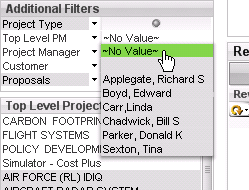 In the illustration below, one or more projects exist that have no project manager assigned, so the ~No Value~ filter option is available in the Project Manager filter list.