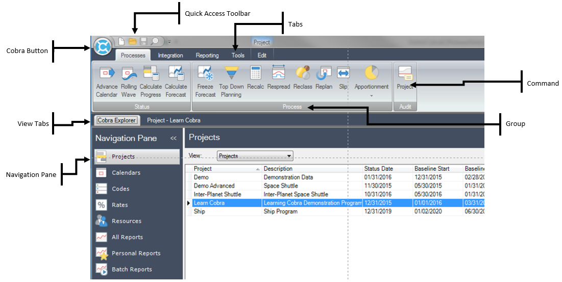 Cobra uses the ribbon interface, which display commands in a series of icons stored on different tabs.