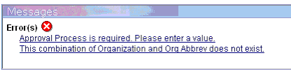 Error messages are hyperlinked so you can click on the error message to go to the offending field/line. Most messages are linked to objects, so when you click on the error message, focus will be set on the offending object. [Some messages, however, may be linked to the line or to the result set. In such cases, clicking on the hyperlink may not clearly give you the context clue, since the focus may already be at the line or the result set level.]