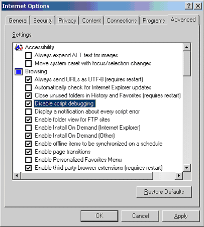 IF you have SELECTED the Disable script debugging checkbox in the Browser Settings portion of the Internet Explorer\Internet Options\Advanced screen (see example above) AND if you have NOT SELECTED the Display a notification about every script error checkbox, the error message will not display.
