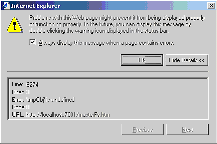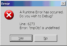 If you have not selected the Disable script debugging checkbox in the Browser Settings portion of the Internet Explorer\Internet Options\Advanced screen, the system will display the error and will offer the option to debug the script (see screen below). If you have installed a Script Debugger in your client PC, you can click on the Yes pushbutton to view the specific line of offending code.