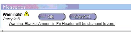 If a warning message is encountered on Save, it will display only if there are no validation errors found before Save can proceed. In the case of a warning message display, you can select either the OK or Cancel pushbutton: