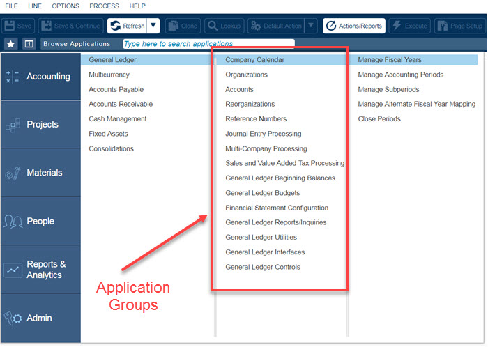 In the example above, when the Company Calendar group is selected, applications that belong to that group (for example, Manage Fiscal Years, Manage Accounting Periods, Manage Subperiods, Manage Alternate Fiscal Year Mapping, and Close Periods) display on the right-hand pane.