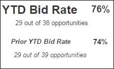 The YTD bid rate summary displays the bid rate for the current year through today's date, based on either the number of opportunities that your firm submitted a bid on or the total estimated revenue for those bid opportunities. For comparison, it also provides the bid rate as of the same date in the prior year.