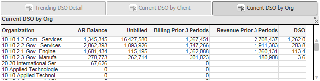 The Current DSO by Org table displays, by organization, current AR balance, current unbilled balance, total billing amount for the prior three periods, total revenue for the prior three periods, and the DSO value.