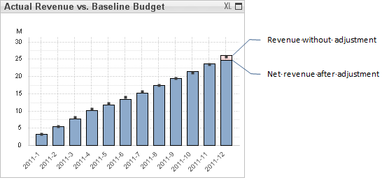 In this illustration and the one following, the firm has selected the Cost and Revenue option, so the prior year revenue adjustments are assigned to the final period of the year and are displayed as a segment at the top of the bar for that period. In this case, the adjustment amount is negative.