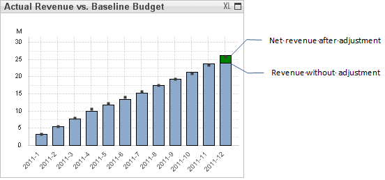 If the prior year revenue adjustment is a positive amount (as illustrated below), it appears as a solid green segment at the top of the bar. The top of the green segment represents the net revenue for the period, and the top of the blue segment represents the revenue for the period without the adjustment.