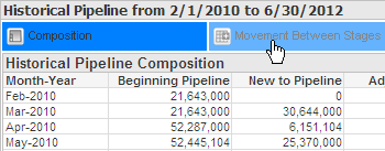 Example: In the Historical Pipeline tab, the Historical Pipeline Composition tables are displayed by default. To display the Movement Between Stages table instead, click the Movement Between Stages tab.