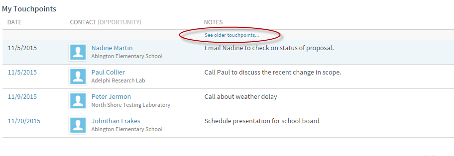 The My Touchpoints grid displays your upcoming touchpoints and other activities, with the one scheduled soonest at the top. To view past touchpoints and other activities, click See older touchpoints at the top of the grid.