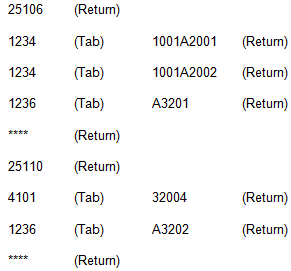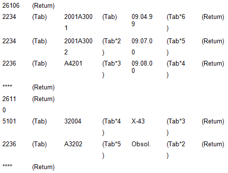 The import file must be a tab-separated ASCII file, structured as shown below. You can create tab-separated files by saving data in text format in a word processing program or a spreadsheet. As shown in the example below, you must enter a tab to separate one field from another. This means that if you do not want to enter a value in a given field, you simply enter an extra tab. The import file must contain a tab for each field skipped on a line. When you import serial number information of the type “Purchase,” each line must therefore contain a total of 8 tabs and end with a carriage return. Importing Serial Number Information of the Type “Purchase.” If you import serial number information for the Item Purchase module, (that is, you have selected “Purchase” in the pop-up field “Type”), the import file must contain one or several blocks structured as follows: