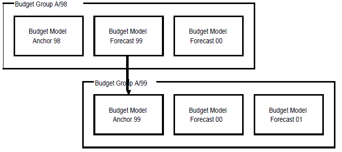 A company budgets three years in advance. So they operate with three budget models called Anchor 98, Forecast 99, and Forecast 00. These are members of the same budget group, “A/98,” as shown in the figure above.