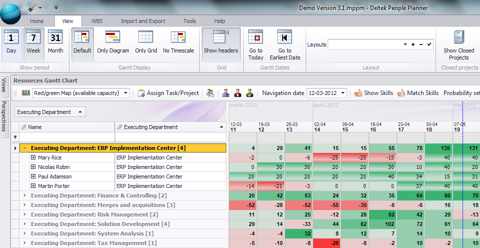 The resource overview is dynamic, which means that you can drag any column in the grid to the free area. This enables you to view the available capacity according to any grouping that you selected. You can also switch the view to plan by day, week, or month (shown in the following figure).