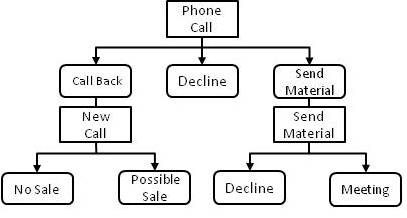 In this example, the customer is first contacted by phone. This contact is represented by an event (created as an initial event, based on an event template in the event plan of the flow). In an option list, the following outcomes of the phone call have been set up: “Call back,” “Decline,” and “Send material.” This option list has been assigned to the initial event, allowing the employee who contacts the customer to select one of these options, thus specifying the result of the event.