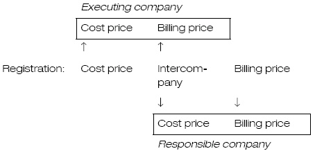 However, if the Create intercompany entries for companies with same parent company system parameter is not marked, intercompany entries are only created if the two companies involved are not both assigned to the same parent company. In this way, the cost price of the responsible company equals the intercompany price of the registration, which in turn is the executing company’s billing price.