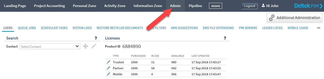 Use the Admin Zone to manage users, restore recycled documents, and manage DMS filters and suggestions. You can also view system logs, queued jobs, and scheduled tasks.