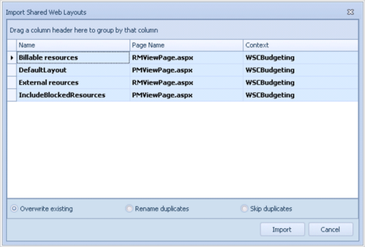 - Overwrite existing: Overwrites the existing Shared Web Layout with the imported one.