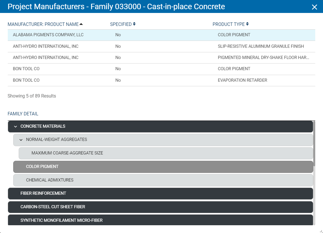 Use this window to view the listed and specified manufacturers for a given family and gain insight into the products that design professionals selected for their A/E firm's project.