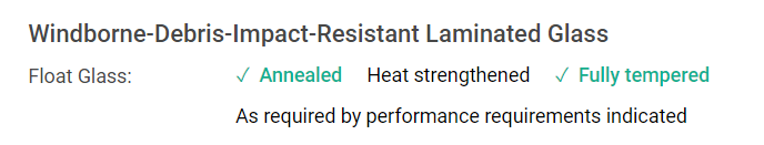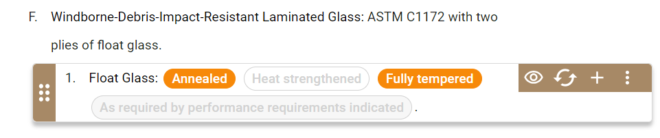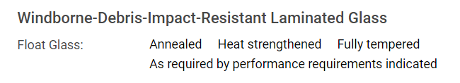 The product type property is defined by the paragraphs's property key, such as Float Glass. The property's options are represented by option set items, such as Annealed. When an A/E firm user selects a property option, Specpoint filters the available product listings for the project to show only listings that have product property options that match the selection in the product type property paragraph. This ensures that the A/E firm user can only select product listings that fit the product requirements that the user specified.
