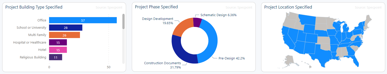These Specpoint data widgets show the number of times that your product listings are specified, based on specific criteria. The criteria used are intelligent project parameters within Specpoint for A/E firms, enabling you to focus on project development aspects relevant to product selection.