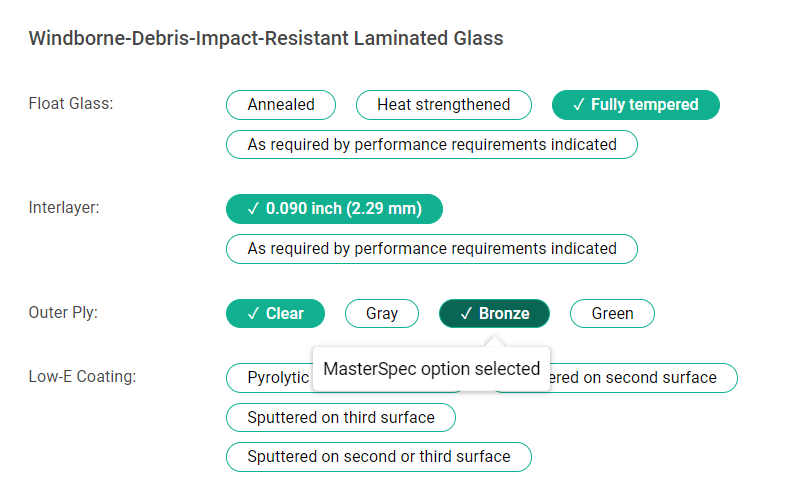 For example, under the ALUMINUM WINDOWS product type and under Windborne-Debris-Impact-Resistant Laminated Glass:- For Float Glass, select Fully Tempered.