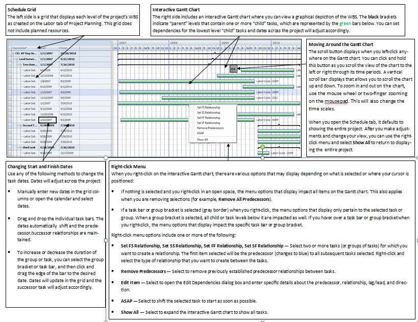 The Schedule tab includes a grid and an interactive Gantt chart where you can create dependencies between tasks.